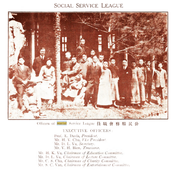在正式开设社会工作课程之前,复旦大学已形成以社会服务与实践为导向的社会学教学积累和浓厚的社会服务传统。1923年复旦已有外籍教授侯金(SAM HOCKINGS,B.A.)教授应用社会学。2在社会实践上,最具代表性的是师生共建的“社会服务团”。1917 年,由沪江大学葛学溥主导创建的“沪东公社”,首开中国社会工作教育之先河。3同年11月,复旦大学学生与约翰大学、澄衷中学、民立中学等校学生共同讨论学生社会服务问题,发起义务夜校,服务本校校工。41918年,复旦大学师生即成立了由校长李登辉指导的社会服务团(后改名公民服务会),外籍教授EUGENE DAVIS和当时在校任教的中国社会学家陈定谟具体参与其中。