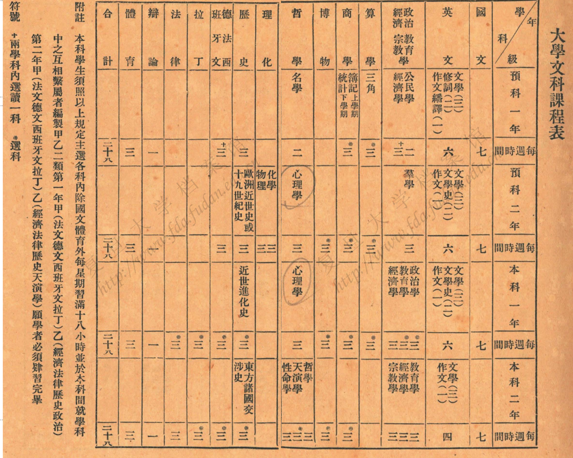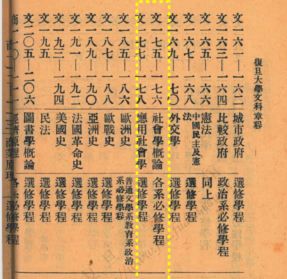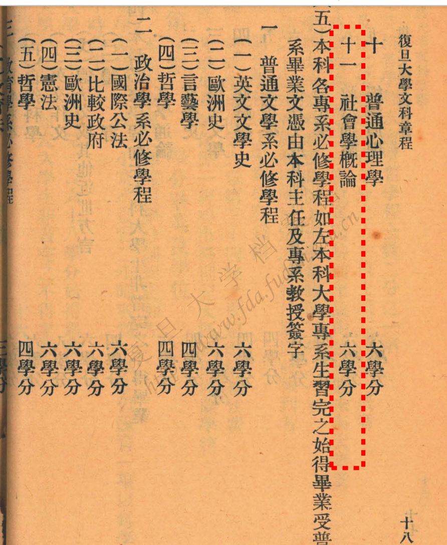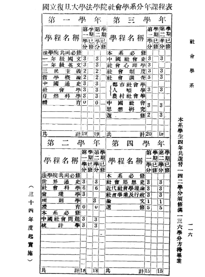 根据1947年《国立复旦大学法学院社会学系分年课程表》显示,该系课程体系分为法学院共同必修课与专业课程两大板块,实行分学年学分制管理。