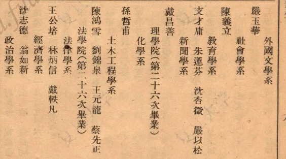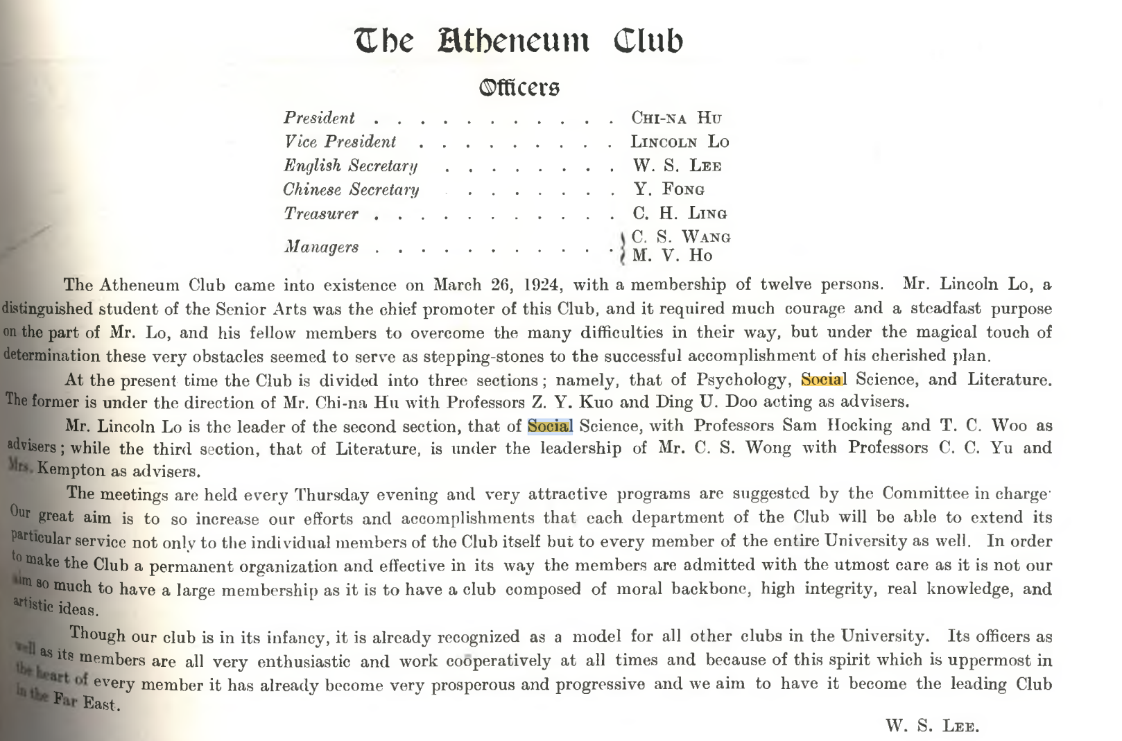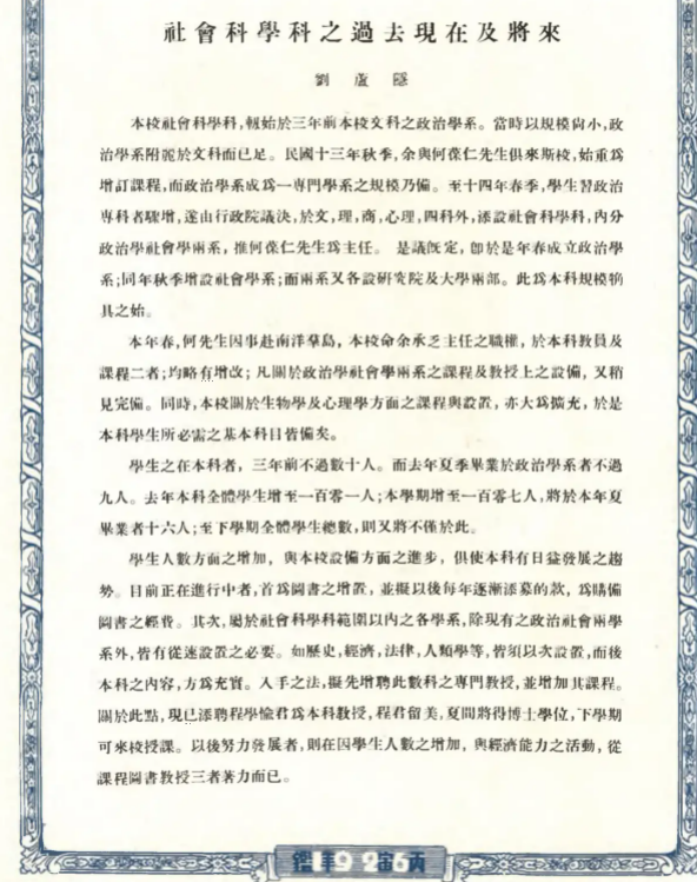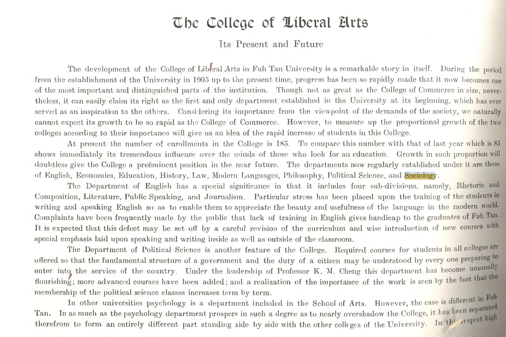 介绍了当时的社会与政治学科,系主任是李登辉,教员包括陈定漠以及以一位. Davis,下设课程包括:公民学、政治学、社会学、人类学与民族学