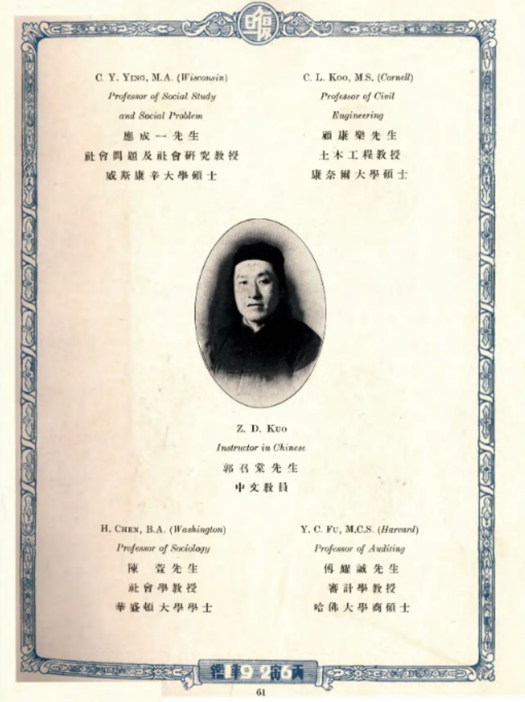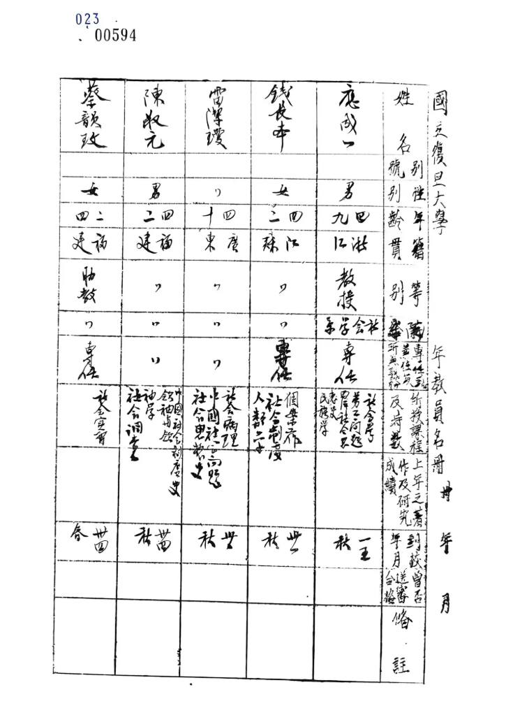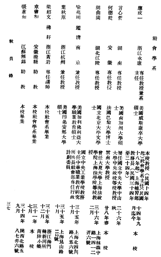 应成一 浙江永康时任教授兼系主任,美国威斯康星大学硕士,从民国14年起开始做本校教授,从民国18年级开始做社会学系主任,从民国34年至20次年做上海补习部教务长。他是从1914年9月到1947年都在复旦大学任教