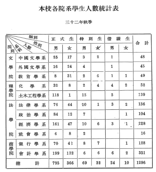 1947年春季社会学系所属的法学院学生总数为656人。1947年秋季社会学系所属的法学院毕业生总数为156人。但档案均未提供社会学系本身的具体师生人数。