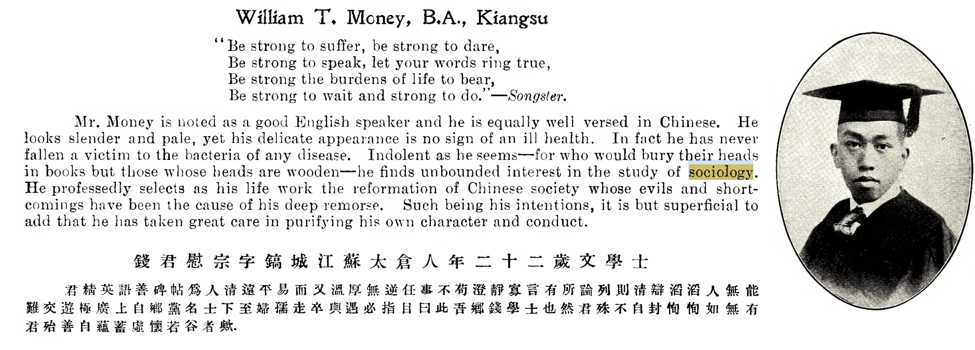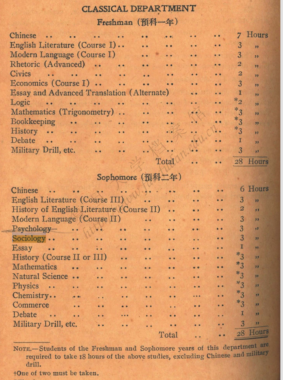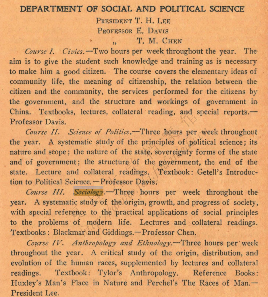 课程三:社会学——全学年每周三小时。 本课程对社会的起源、成长和进步进行系统性研究,特别侧重于将社会学原理实际应用于解决现代生活中的问题。教学方式包含课堂讲授与辅助阅读。 教科书: 布莱克玛(Blackmar)与吉丁斯(Giddings)。——陈教授。 |