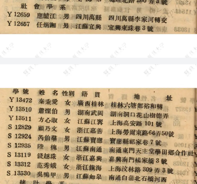 来源:《1948年秋复旦社会学系学生注册表.pdf》 - “社会学系”注册名单。 说明:文档中“业”可能表示“毕业”或“结业”,“休学”表示暂离学校。此名单为1948年秋季状态,部分学生(如班志雯、史林子、程文蕙)在1949年成为毕业生。