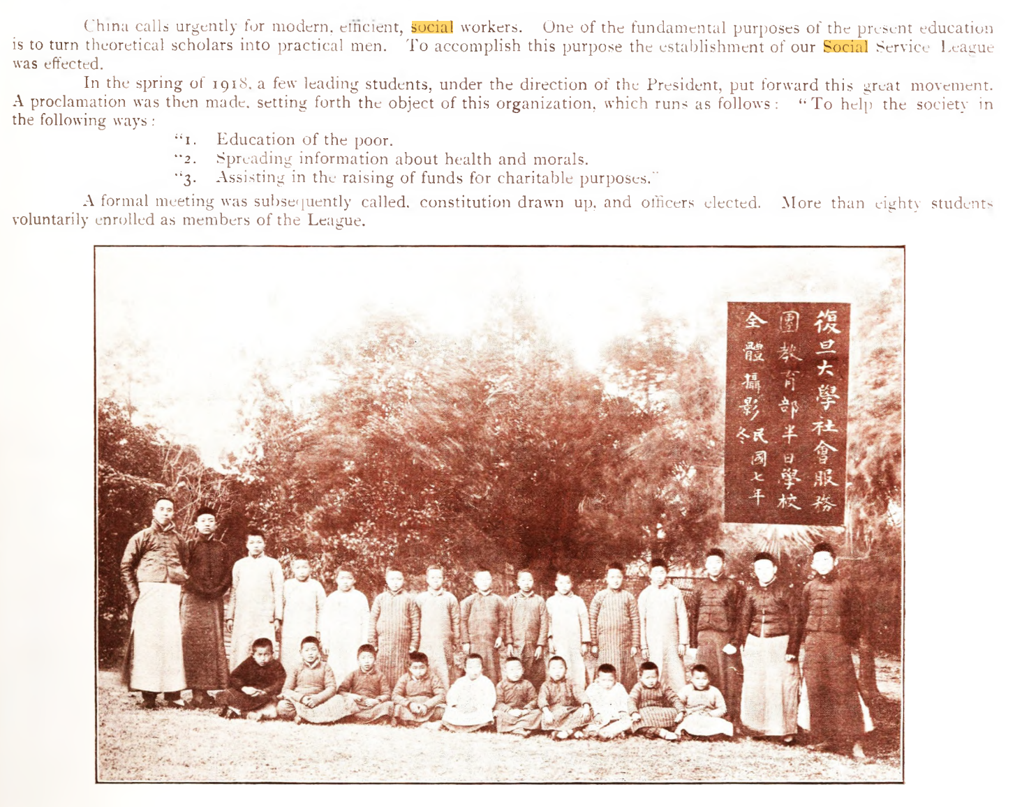 (翻译:“中国亟需现代化、高效率的社会工作者。当前教育的根本目的之一,就是将理论学者转变为实践者。为实现此目的,我们成立了社会服务团。)
