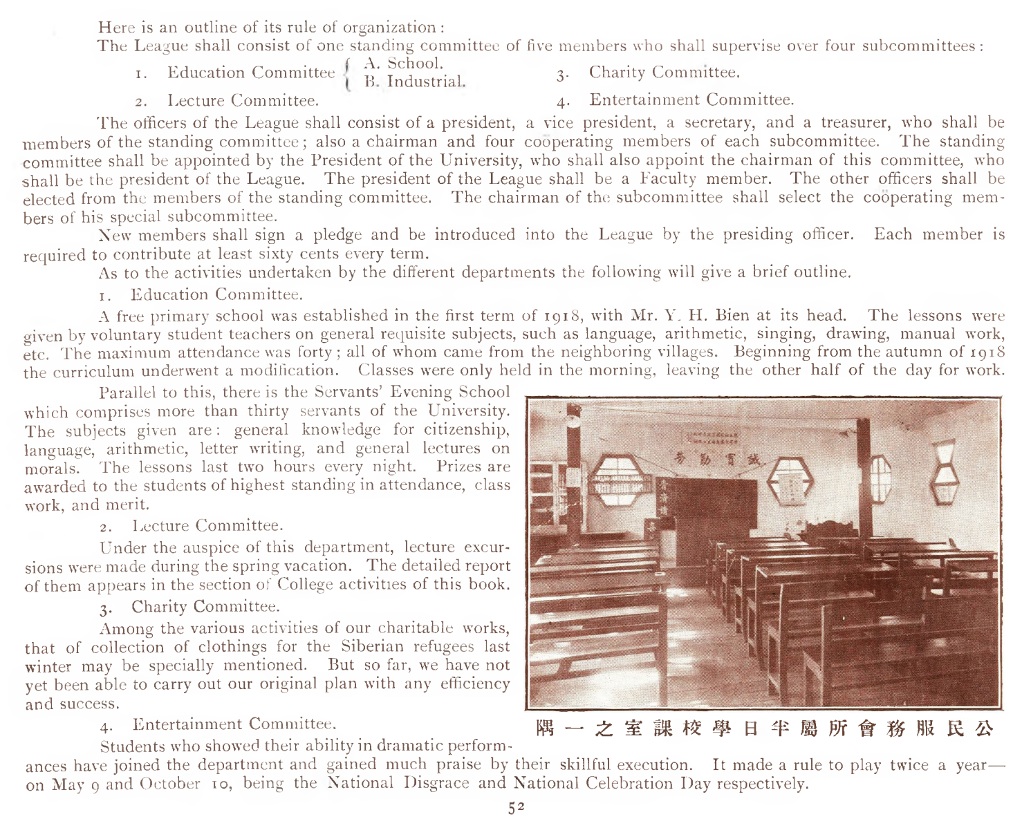 三曰捐款款项以辅助慈善事业,设慈善部及游艺部。会员必具志愿书,纳会费月额二角。时入会者约六十人,乃推定戴维斯教授为主任,竺君为副主任,余君大镭为书记,卞君为会计,张君为教育部主任,张君为演讲部主任,朱君承诜为慈善部主任,范君为游艺部主任。翌年以职员中有离校者,乃改推程君为副主任,厚楷君为教育部主任,余君大镭为演讲部主任,余如旧。今录一年中经办事项分述如左。