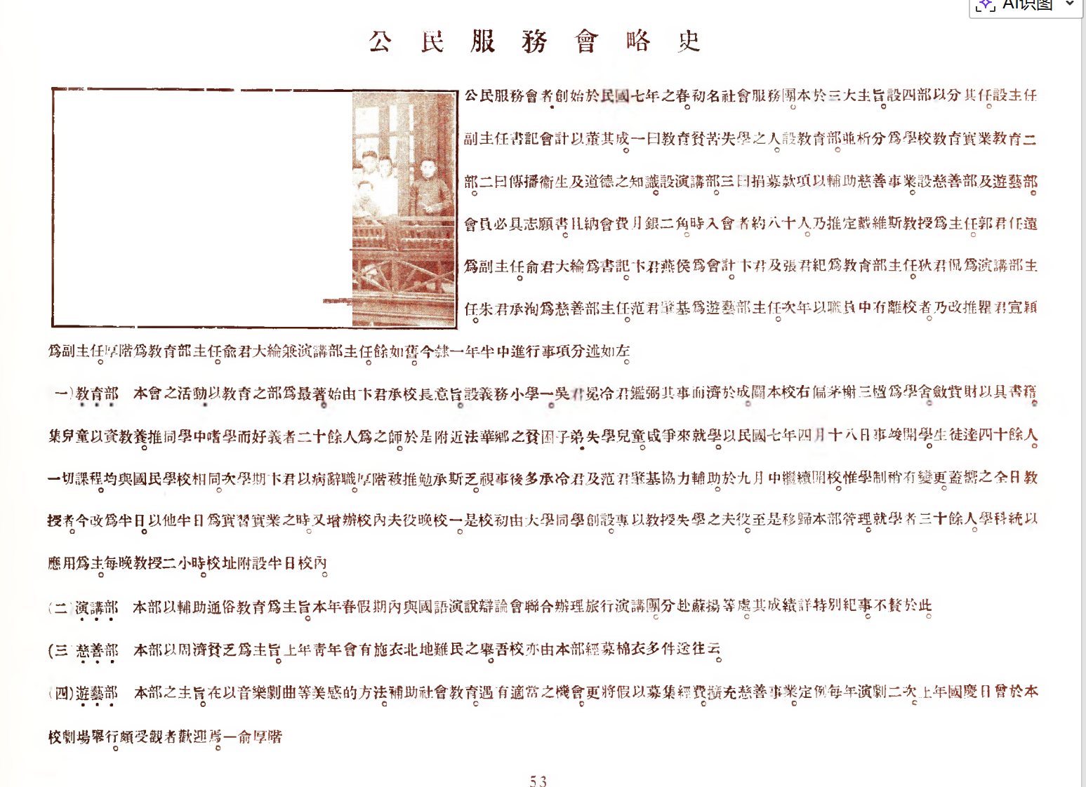 1918年春,在校长的指导下,几位主要学生发起了社会服务团(也称之为公民服务会)。